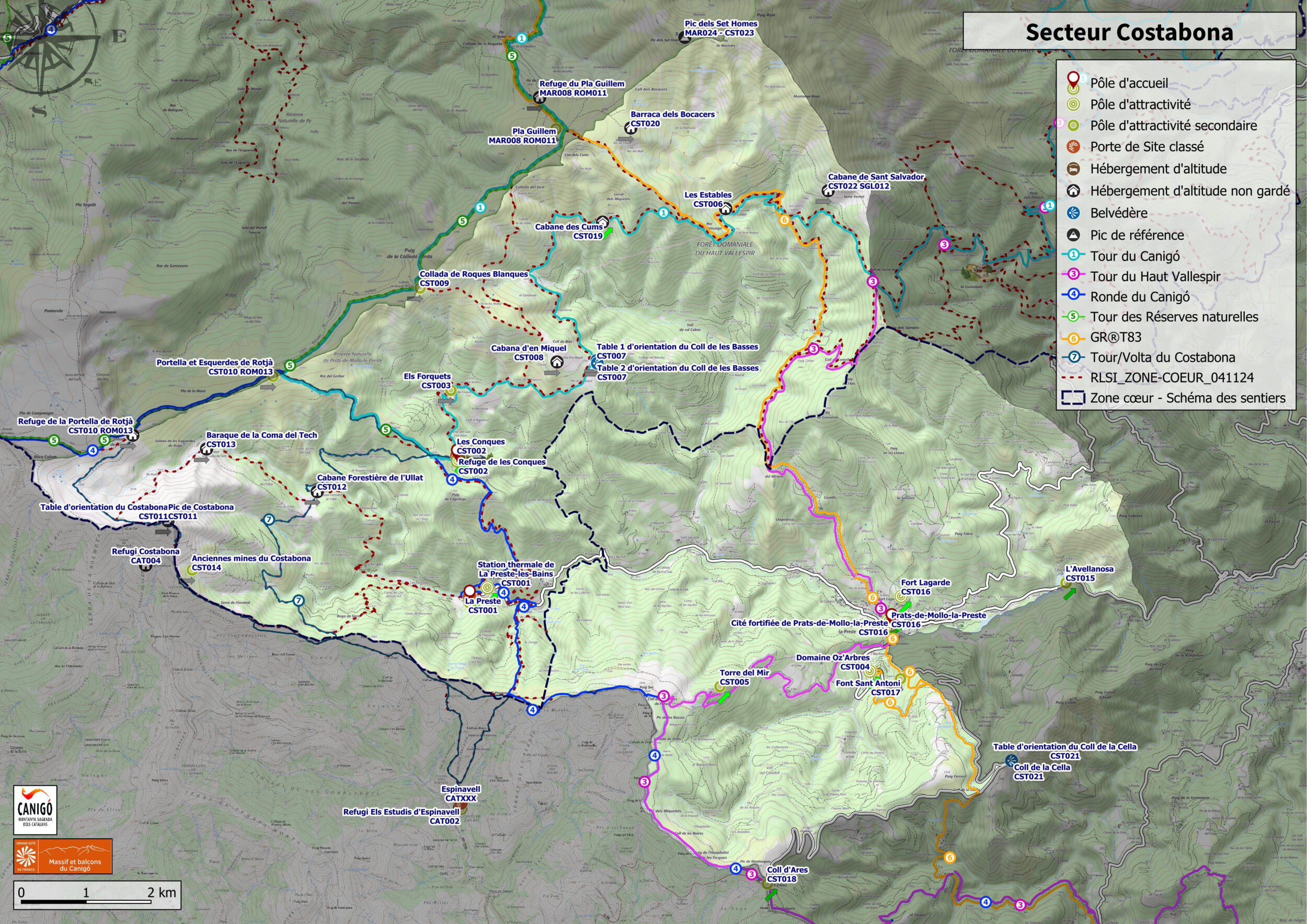 Le secteur Costabona concerne la partie orientale et d’altitude du massif, autour du sommet du Costabona, à la frontière franco-espagnole. Ce secteur se caractérise par de vastes paysages de crêtes, de hauts plateaux et de vallons d’altitude, marqués par le pastoralisme, une forte naturalité et des enjeux importants de préservation de la biodiversité, tout en accueillant des pratiques de randonnée et d’activités de pleine nature.