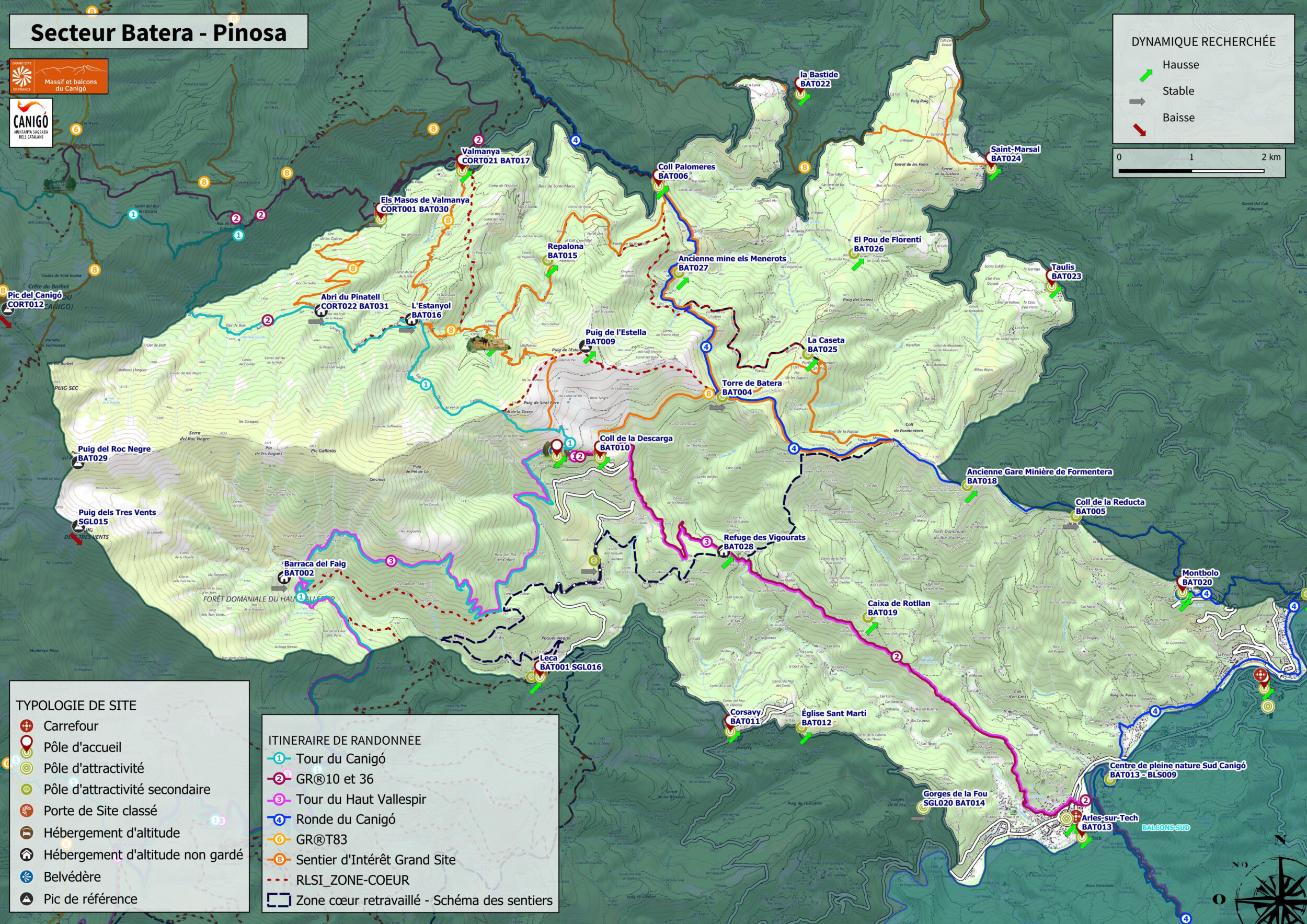 Le secteur Batera–Pinosa correspond à un vaste espace de moyenne et haute montagne marqué par de grands paysages ouverts, des forêts, des crêtes et des estives. Ancien territoire minier et pastoral, il conserve de nombreux témoignages de ces usages historiques, avec notamment les mines de La Pinosa, de Batère ou encore des Ménerots, tout en étant aujourd’hui un secteur privilégié pour les activités de pleine nature, notamment la randonnée et le VTT.